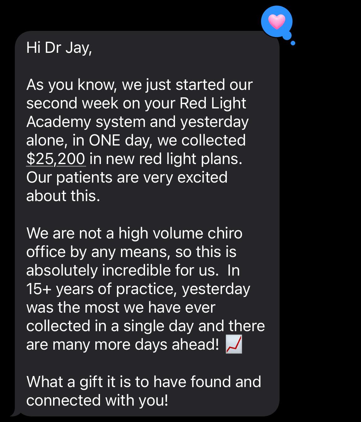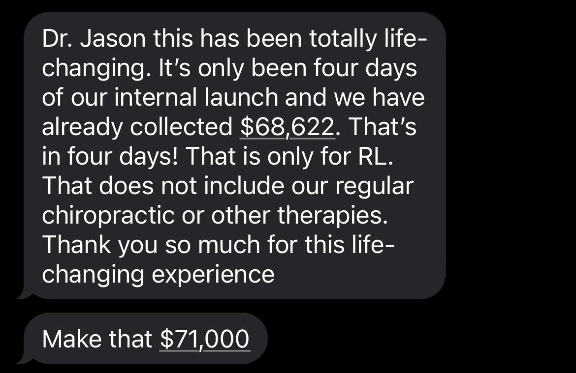 Dr. Jason added Red Light Therapy to his clinic in 2024 and has quickly grown his Red Light program to multiple red light beds and collections to over $100k per month. The content inside Red Light Academy are the exact systems & processes Dr. Jason and his team use in their practice.